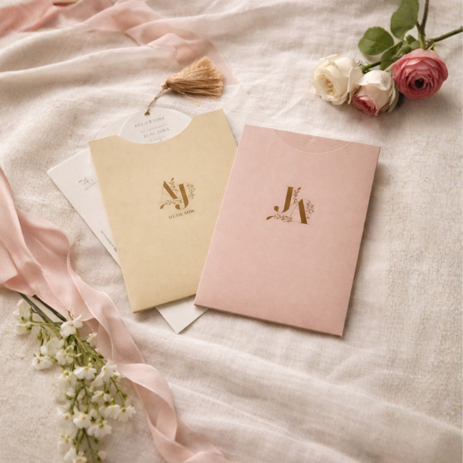 Invitatia poate fi realizata in format dreptunghiular clasic sau in stil arcada, fiind potrivita atat pentru nunti romantice, cat si pentru evenimente cu tematica boho sau garden wedding. Plicul tip toc este disponibil in nuante fine de roz pal sau crem, iar detaliile pot fi adaptate in functie de paleta cromatica a evenimentului.