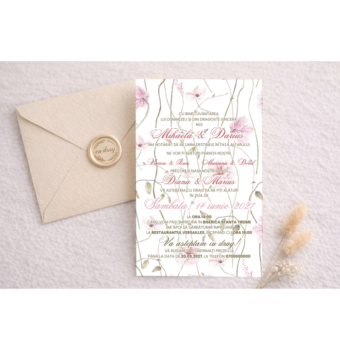 Aceasta invitatie de nunta in format A6 are un design clasic si rafinat, potrivit pentru cuplurile care isi doresc o prezentare simpla, luminoasa si eleganta. Cartonul de 300 g ofera tinuta si stabilitate, iar plicul crem adauga o nota calda si armonioasa. Sigiliul de ceara in nuanta champagne completeaza setul cu un accent discret, premium si memorabil.