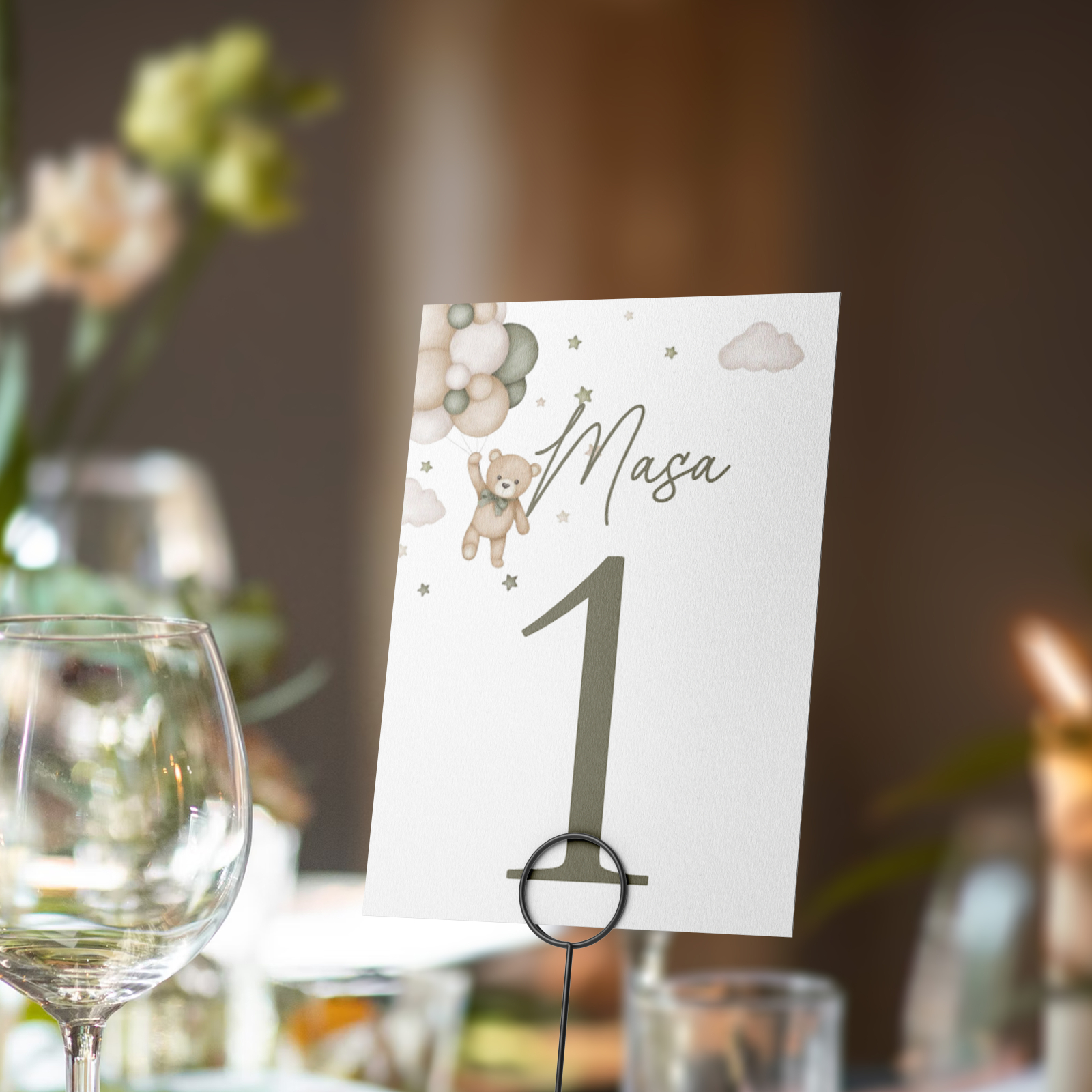 Număr de masă personalizat pentru botez, realizat în aceeași temă vizuală cu plicurile de bani, meniurile și place card-urile din colecția aleasă. Este conceput pentru a fi ușor de observat de invitați și pentru a menține un decor unitar pe toate mesele.