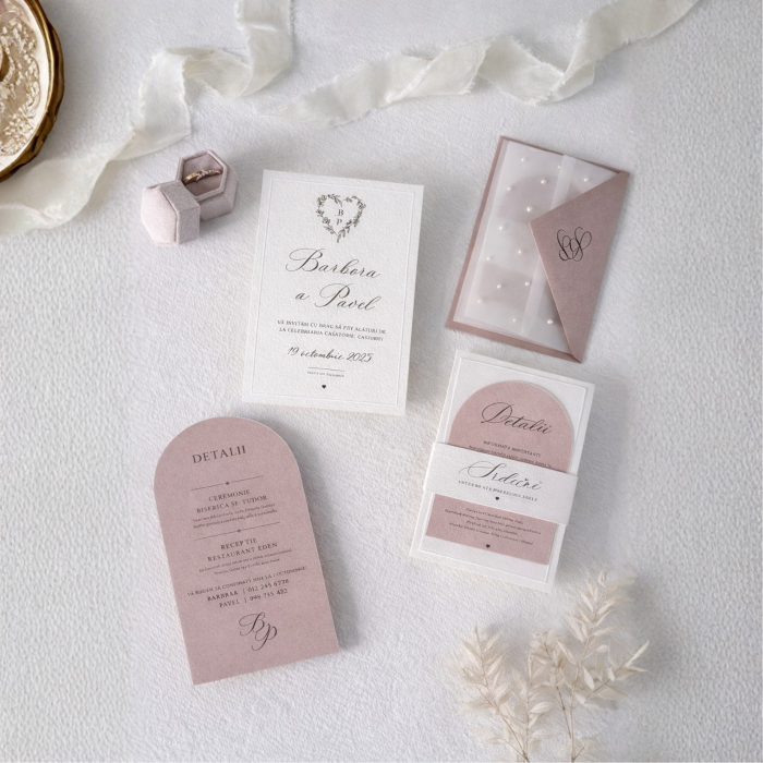 Aceasta invitatie de nunta premium este un set complex si spectaculos, creat pentru mirii care isi doresc un impact vizual elegant si modern. Combinatia dintre plicul roz personalizat cu initiale, invitatie in doua piese si invelisul din hartie de calc cu perle aplicate manual transforma fiecare invitatie intr-un obiect de colectie.