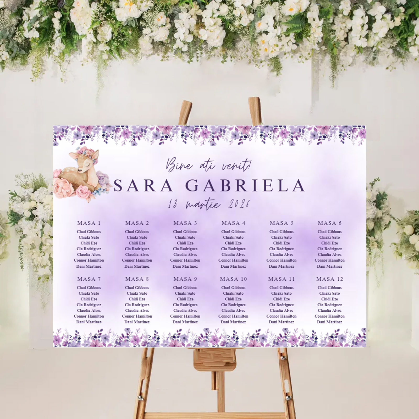 Opis de botez personalizat (plan de așezare a invitaților), realizat în aceeași temă vizuală cu papetăria evenimentului ales din magazin. Este conceput pentru a fi ușor de citit de la distanță și pentru a organiza clar mesele la intrarea în sală.