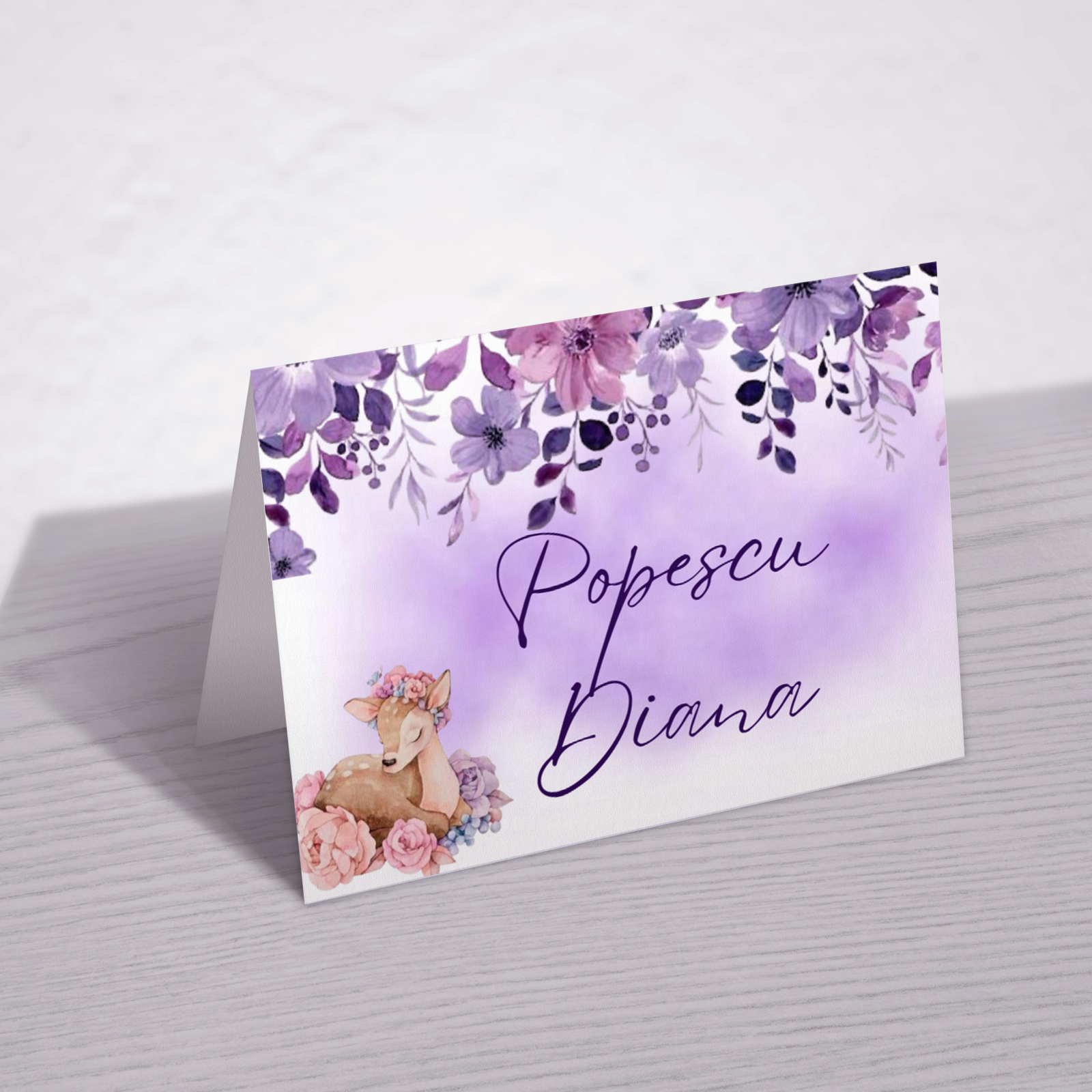 Place card personalizat pentru botez, pliabil tip „tent”, realizat în design asortat cu tema aleasă din magazin. Este destinat așezării pe mesele invitaților pentru o organizare elegantă și clară.